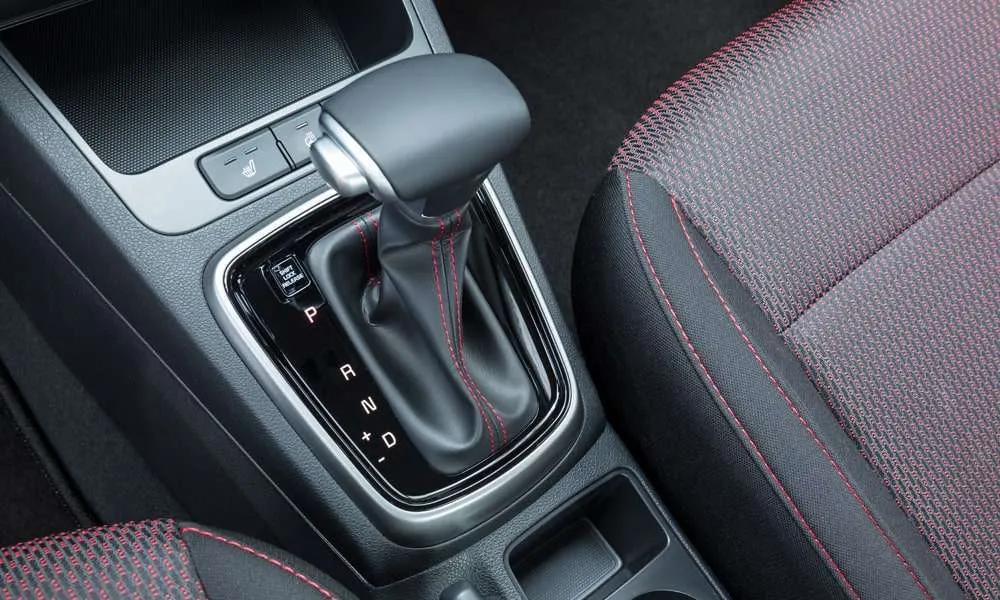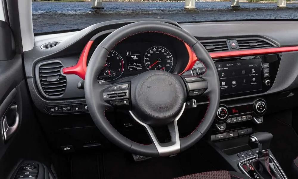 - Селектор трансмиссии и рулевое колесо с красной прострочкой